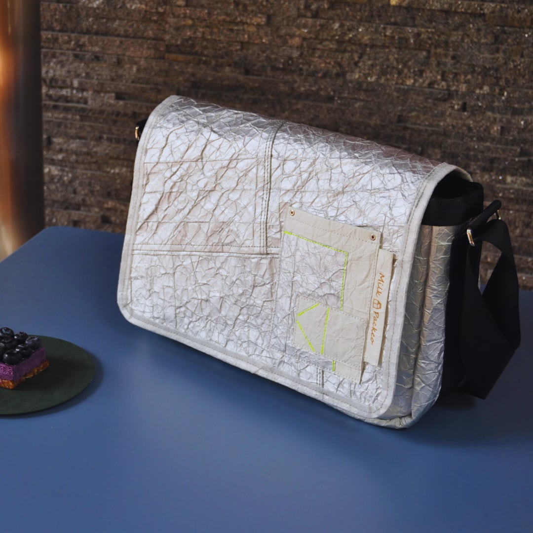 This upcycled messenger bag is crafted by carefully combining fabric offcuts from this year’s production, creating a unique patchwork design—each piece with its own distinct character.