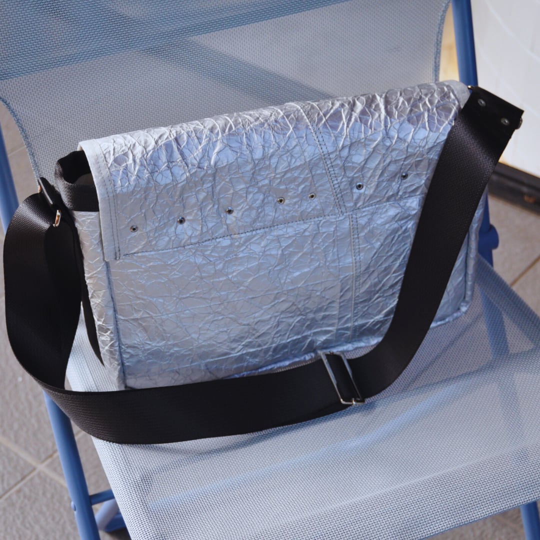 今年の制作で生まれたハギレを丁寧に組み合わせ、ひとつひとつ表情の異なるパッチワークに仕立てたアップサイクル・メッセンジャーバッグです。