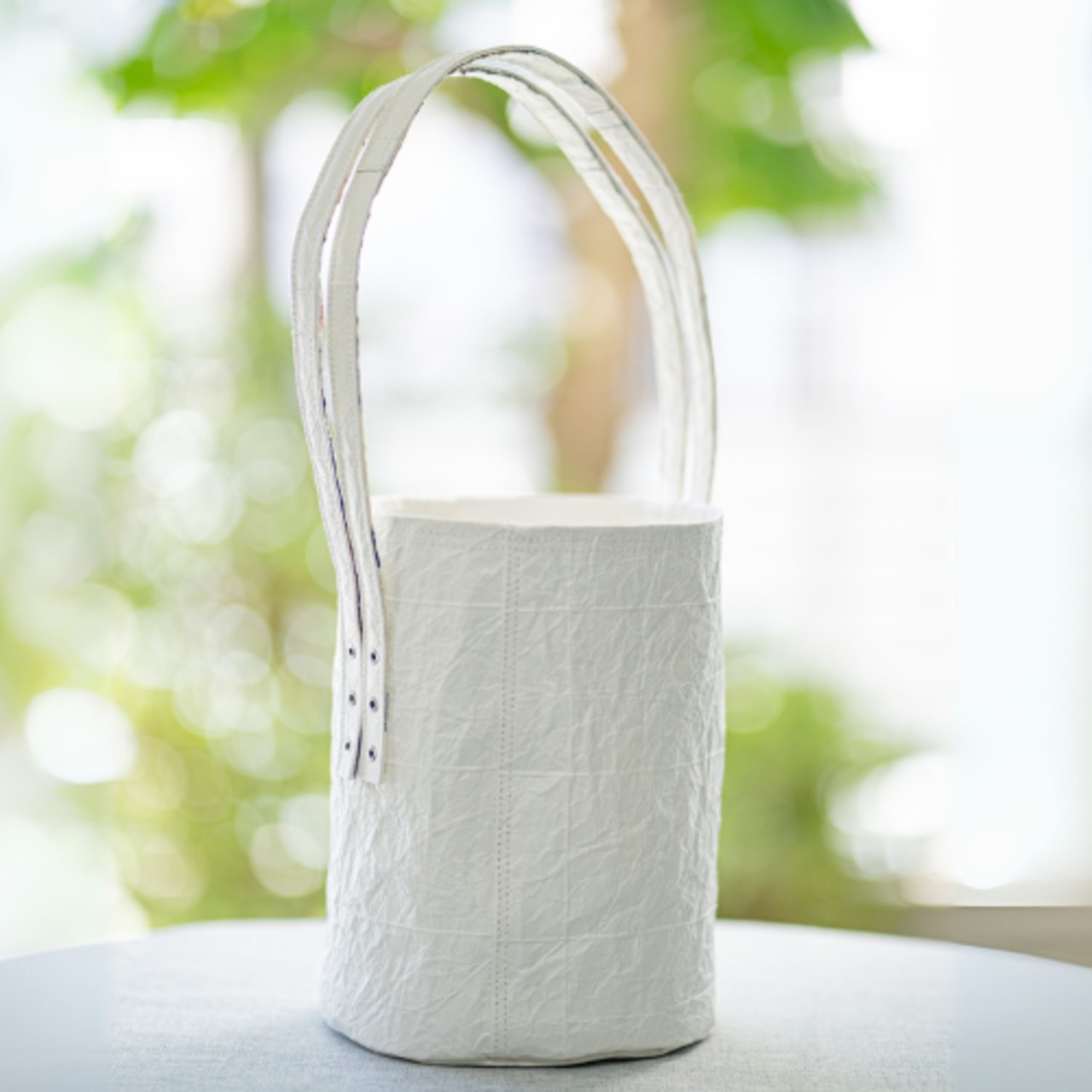 飲み終えた牛乳パックを丁寧に開き、鞣し、縫製して作られたアップサイクルバケツバッグです。二本の持ち手とシルバーのカシメがアクセントになっています。